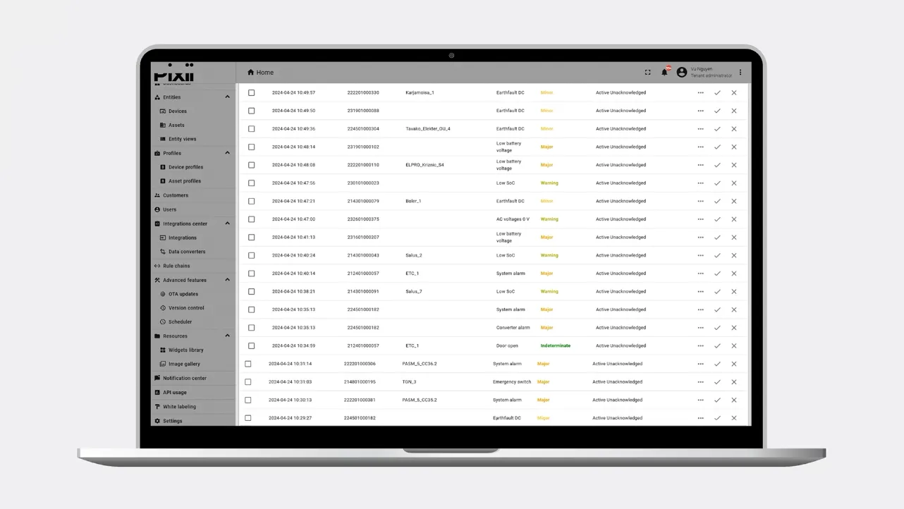 Pixii Cloud bietet einen umfassenden Leistungsüberblick und ermöglicht es Ihnen, Alarme zu verwalten, historische Daten zu sammeln und Einsätze und Wartungskosten zu reduzieren.