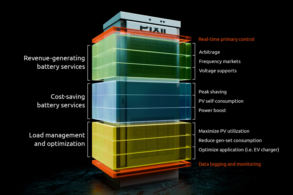 Pixii Energy Architect maximizes the value of energy storage by combining cost-saving services such as peak shaving, PV self-consumption, and load shifting with revenue-generating applications like frequency regulation, voltage support, and arbitrage.