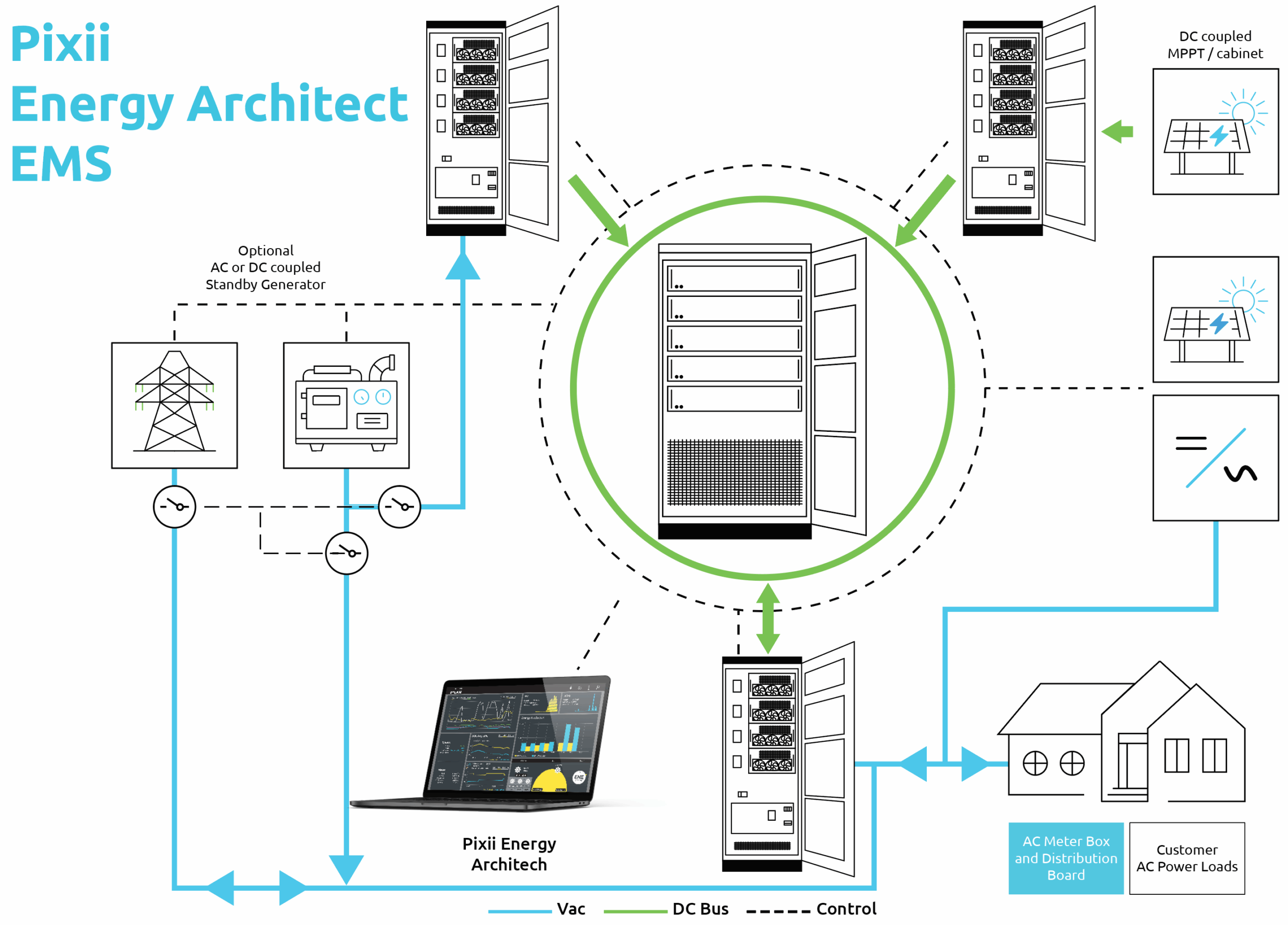 The EMS delivers fully autonomous coordination of power sources and loads. By monitoring system health, grid conditions, and energy flows in real time, it ensures reliable and efficient performance under all operating conditions.